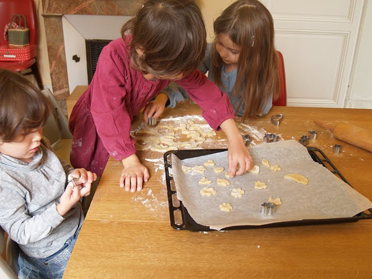 Comme il pleuvait dehors, je leur ai proposé de faire des petits sablés. Toutes les 3 ont sauté de joie et se sont mises au travail. Verser, remuer, casser les œufs, couper le beurre.... il y tant de choses à faire pour confectionner une bonne pâte à gâteau. Clémence à découvert la balance et très attentive, elle s'est bien appliquée pour peser 250g de farine. Ensuite elles ont découpé les biscuits avec les emportes pièces et je les ai cuit. Ce qu'il y a de bien avec les biscuits c'est que tout le monde peut participer et c'est très vite cuit !